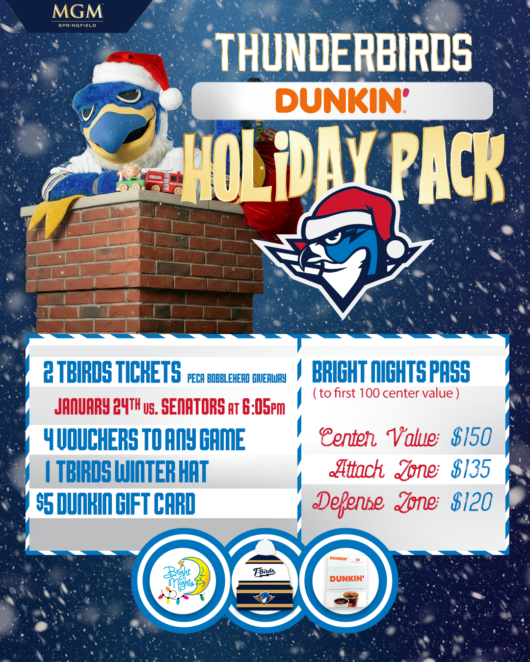 Kick off the new year with a great holiday deal for the T-Birds fan in your life! Starting at just $120, each Dunkin’ Holiday Pack includes: