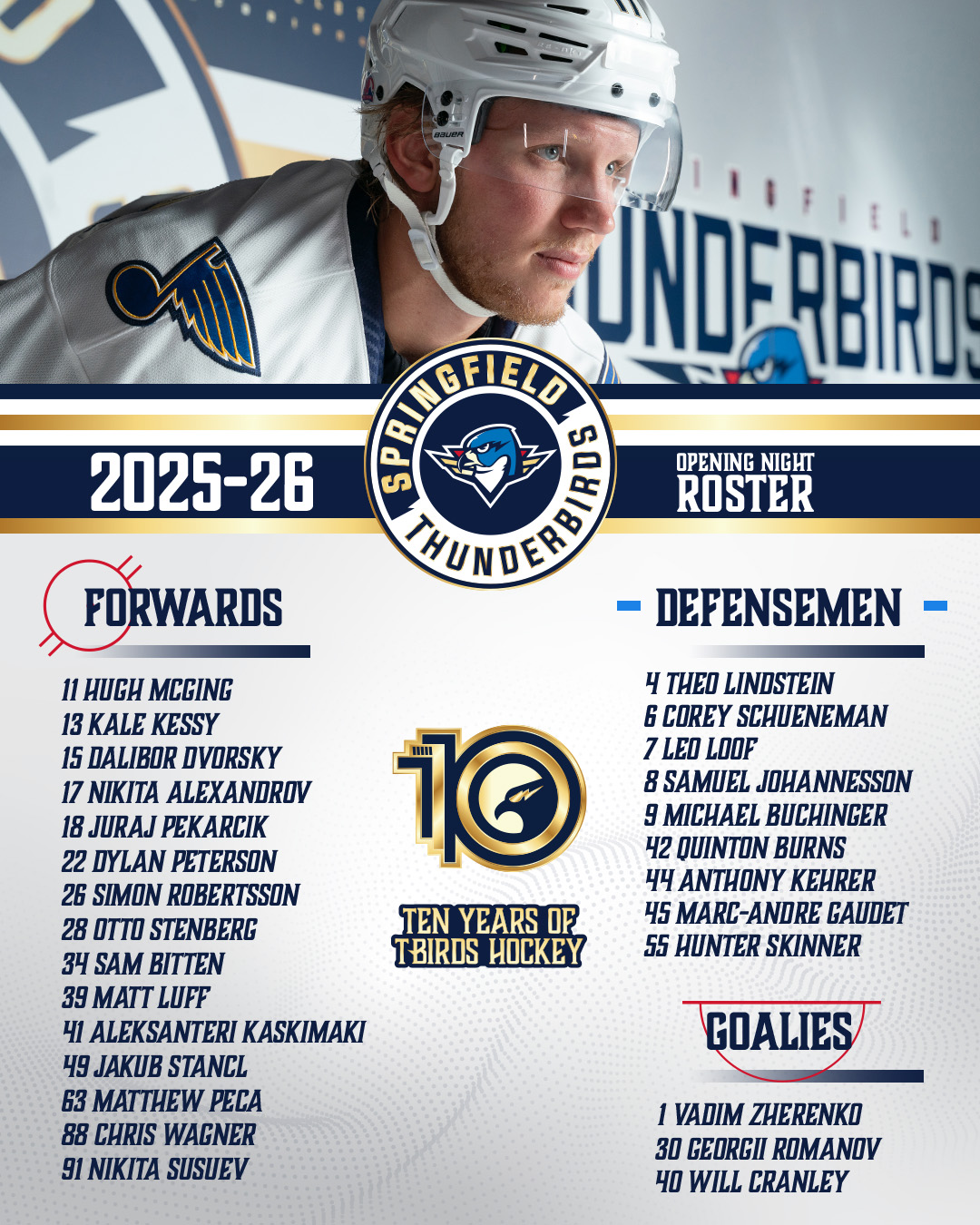 SPRINGFIELD, Mass. – The Springfield Thunderbirds unveiled their Opening Night roster for the 2025-26 season on Thursday. For a full team breakdown, including bios and stats, click here.