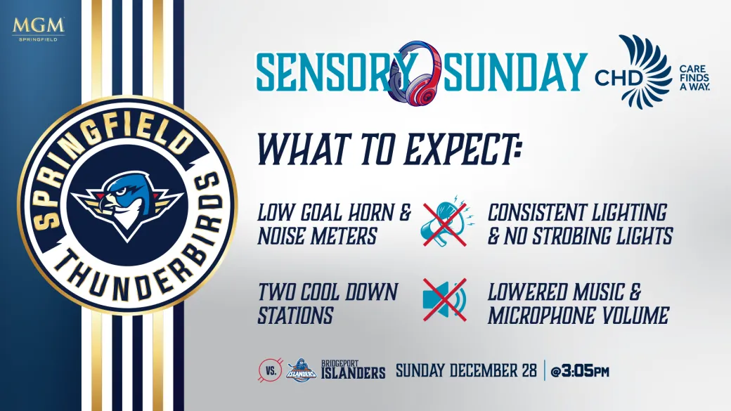 SPRINGFIELD, Mass. - The Springfield Thunderbirds, in partnership with the Center for Human Development (CHD) and Springfield College’s Department of Occupational Therapy, will be hosting their 6th Annual Sensory-Friendly Game on Sunday, Dec. 28 at 3:05 p.m. when the Thunderbirds host the Bridgeport Islanders at the MassMutual Center.